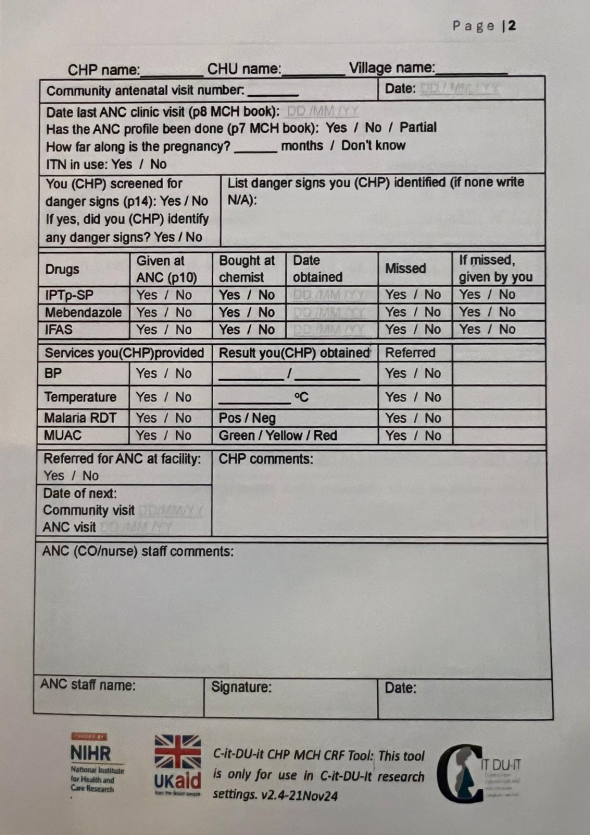 The CHP-CRF has become a seamless part of the documentation tools mothers already carry. It is issued either at the ANC clinic or during home visits, ensuring that every mother’s journey is captured from the very beginning.
